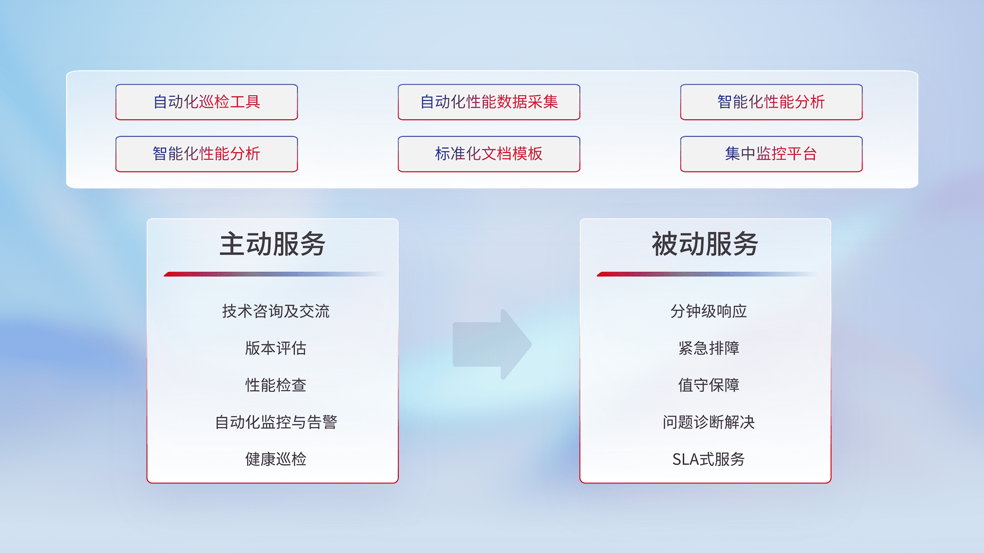 智能化工具和标准化文档,,,,保障服务质量,,,提供主动服务(包含技术咨询、、、版本评估、、、、性能检查、、自动化监控与告警、、、健康巡检)和被动服务包含(分钟级响应、、、、紧急排障、、、值守保障、、、、问题诊断解决、、、、SLA服务)。。。